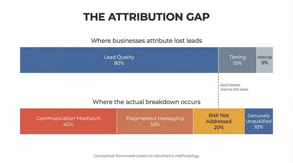 The failure, Abraham argues, belongs to whoever couldn’t communicate the value clearly enough, couldn’t demonstrate the outcome convincingly enough, couldn’t reduce the perceived risk sufficiently enough. The prospect had a problem. You had a solution. The gap between those two things? That’s not a “lead quality” issue. That’s a communication breakdown.