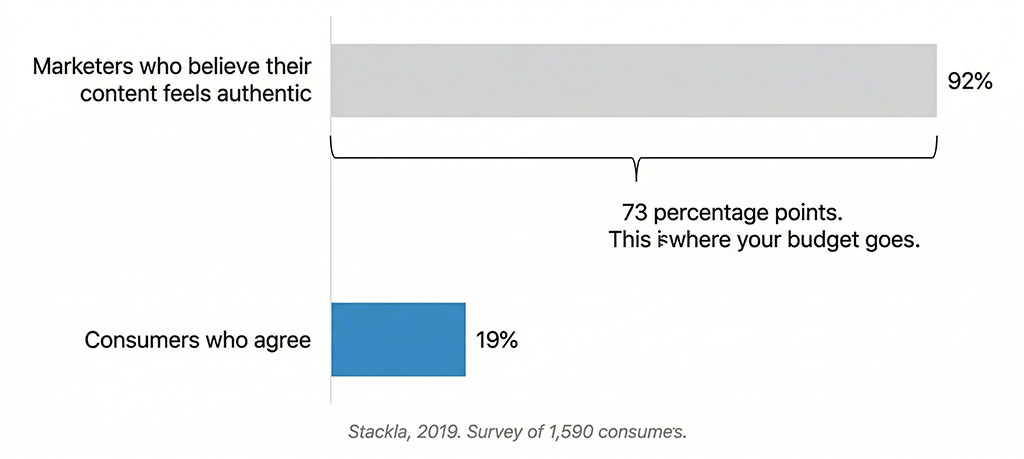 Ninety-two percent versus nineteen percent. The gap between those numbers — 73 percentage points of misplaced confidence — is where most marketing budgets disappear. Marketers are producing content that feels authentic to them and alien to the people they’re trying to reach.