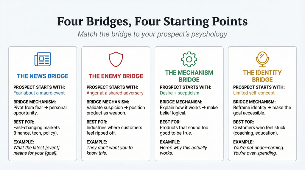 The bridge you choose depends entirely on where your prospect is standing. Are they scared? Angry? Sceptical? Stuck? Each starting emotion demands a different structure. This is not a template. It’s a diagnostic.